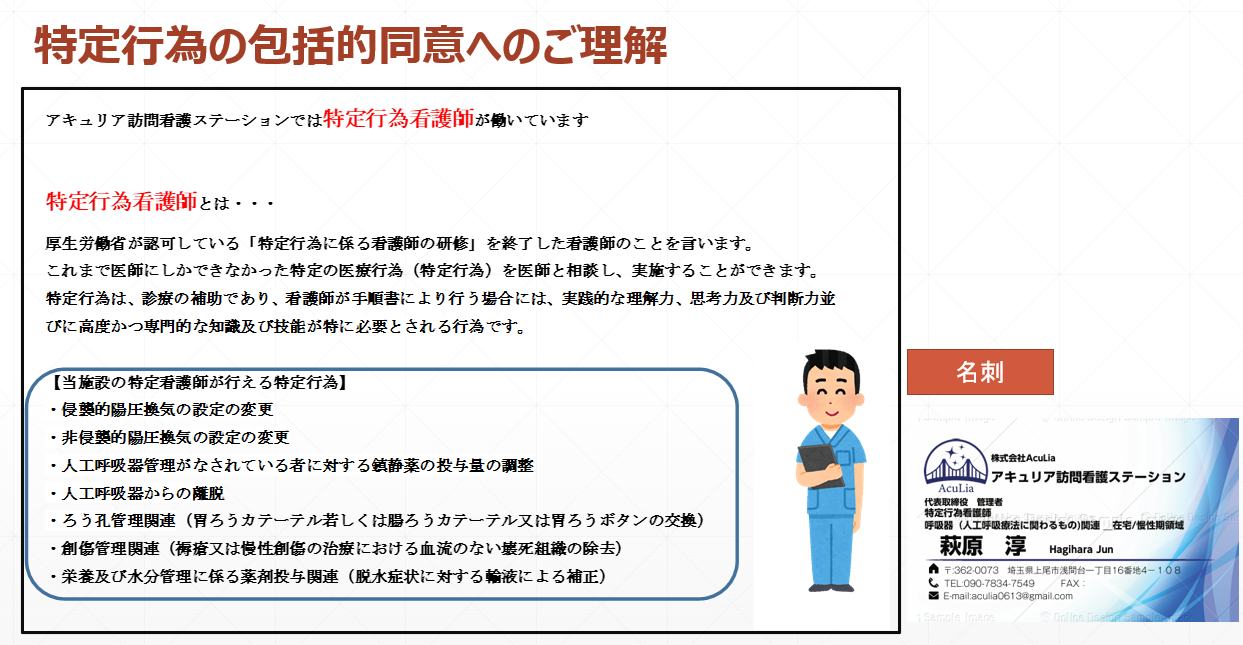 訪問看護サービスを利用検討中の方へ案内 訪問看護とは 訪問看護は、訪問看護師等がお住まいに訪問して療養生活を送っている方の看護を行うサービスです。スライドに示すように、本人や家族の思いに沿った在宅療養生活の実現に向けて、 […]