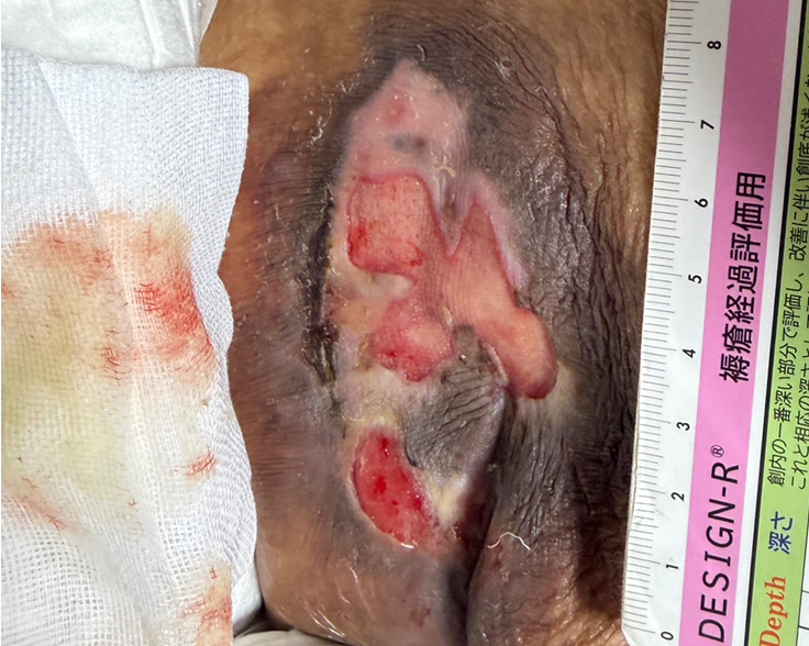 仙骨部に褥瘡発生後、自宅で家族による褥瘡ケアを行っていたが拡大傾向のため、訪問看護介入開始となった。